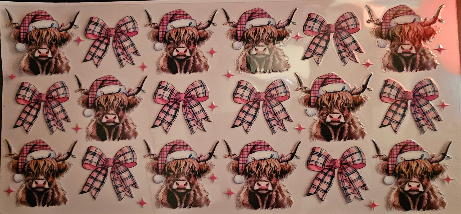 Cow with plaid Santa hat and bows.