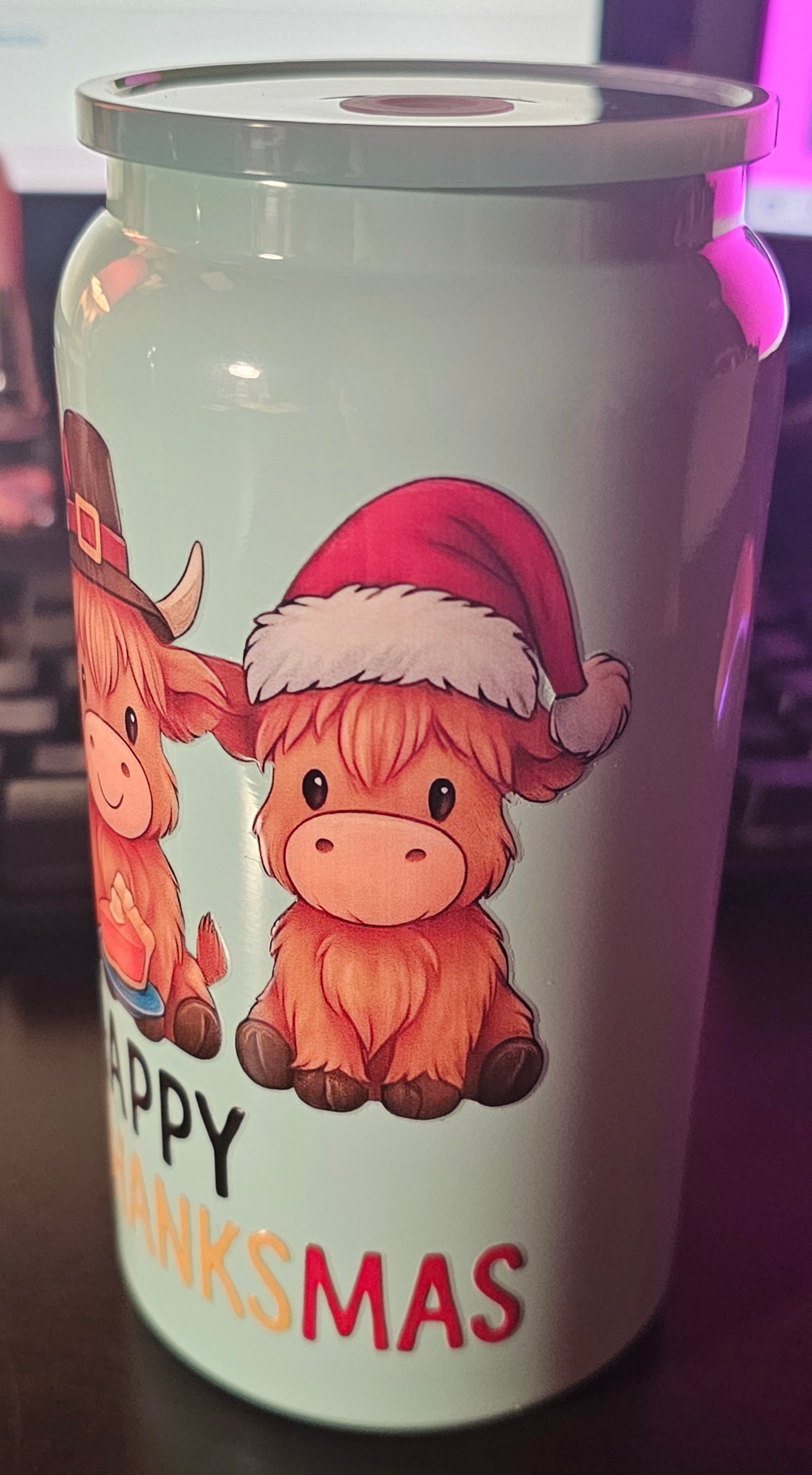 16oz stainless steel cup. It has a cow for Halloween, Thanksgiving, and Christmas.