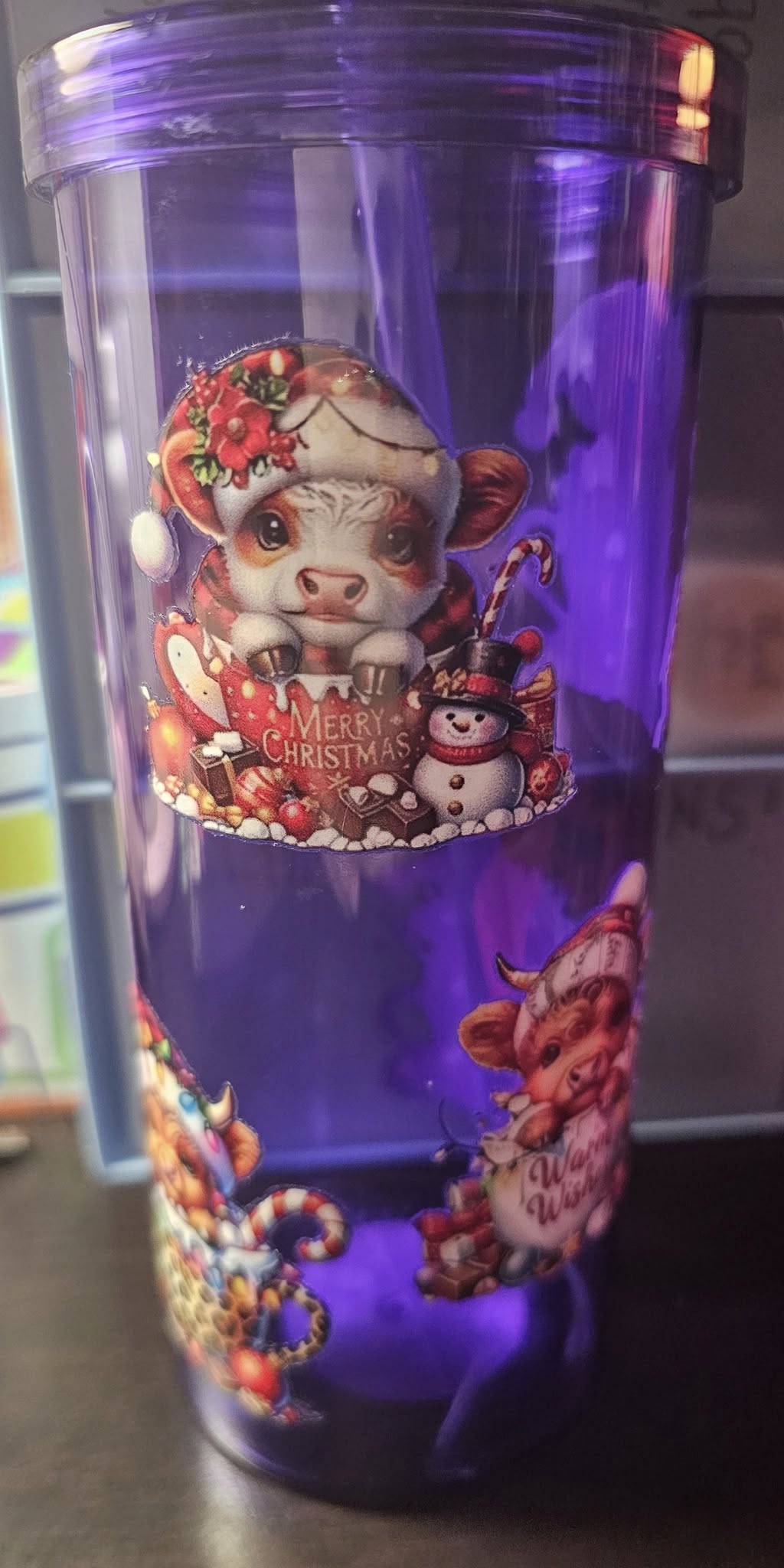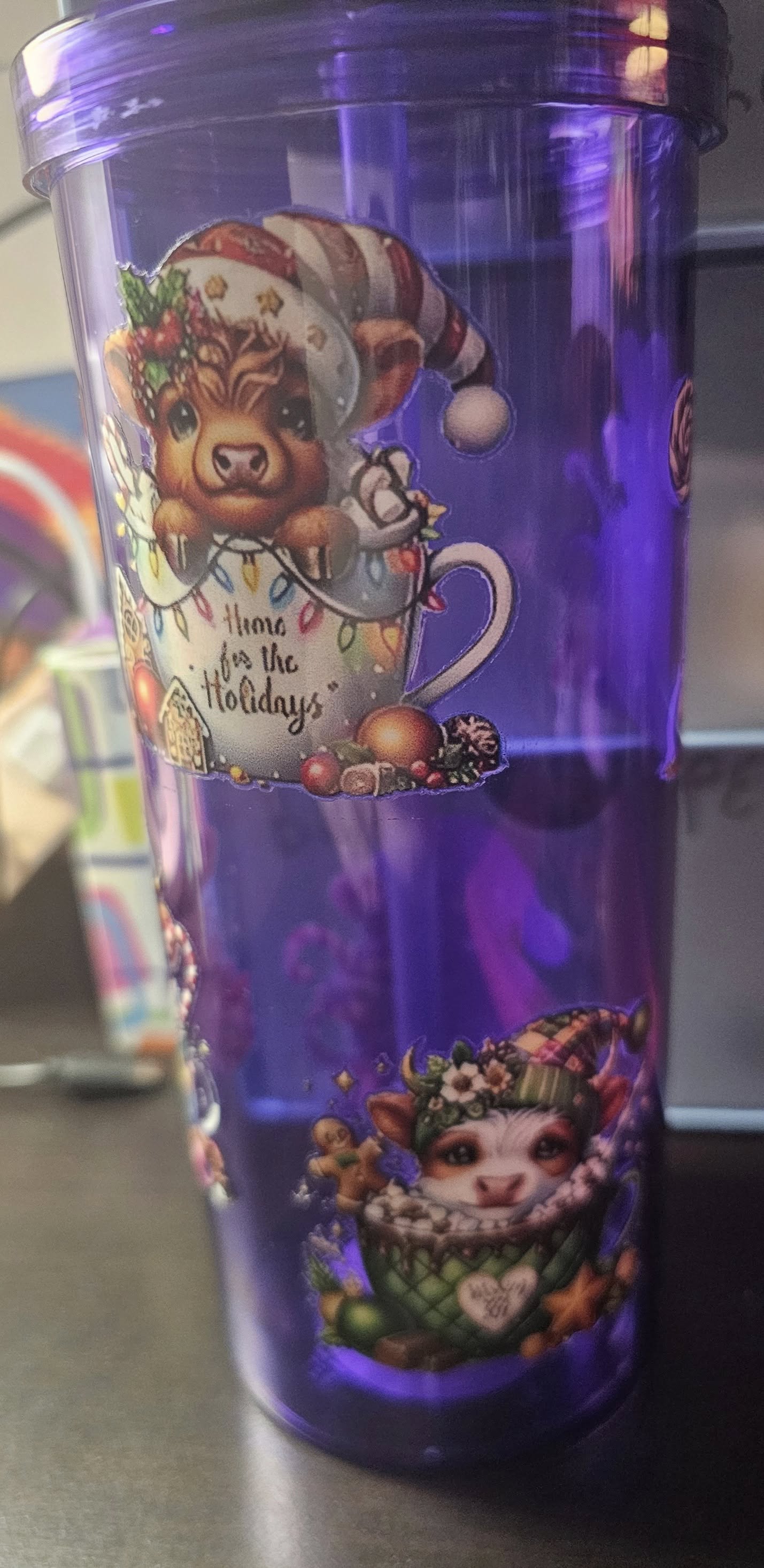 20oz cup with Highland Cows in cups with Christmas sayings on cups.