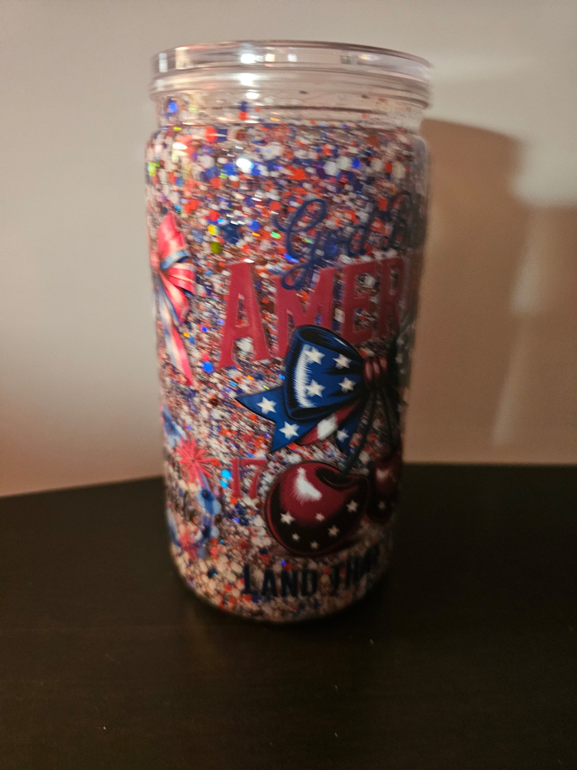 This is a 16oz snow globe cup that has glitter that glows in the dark.