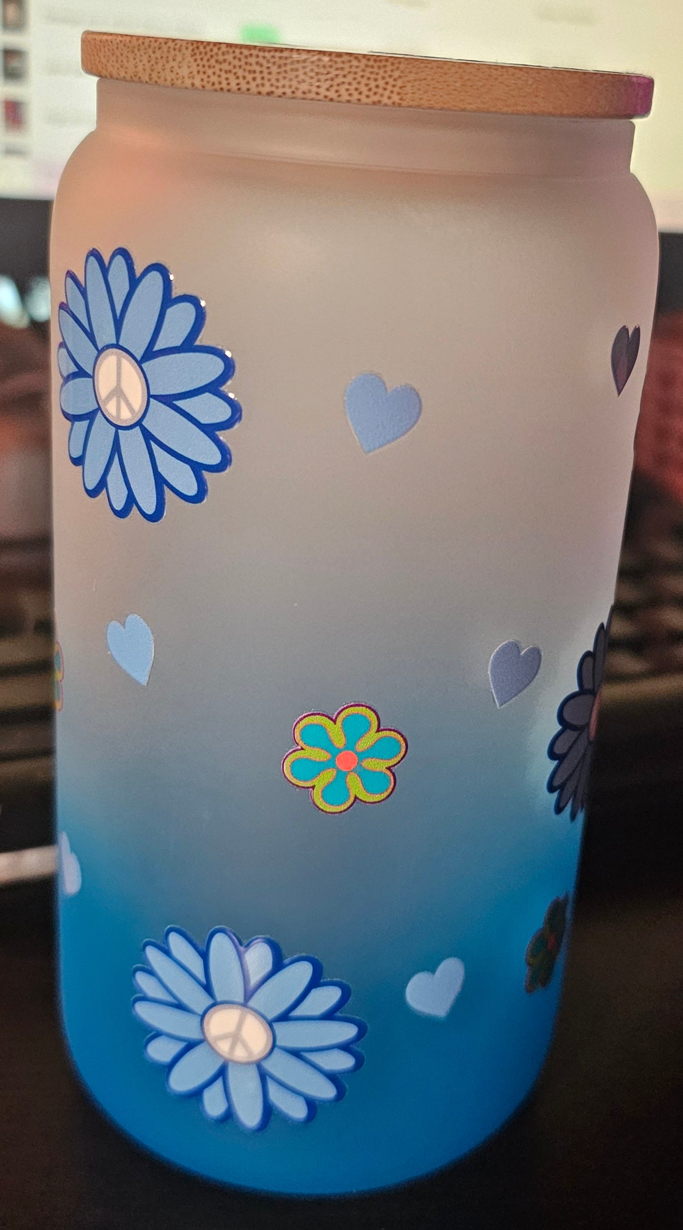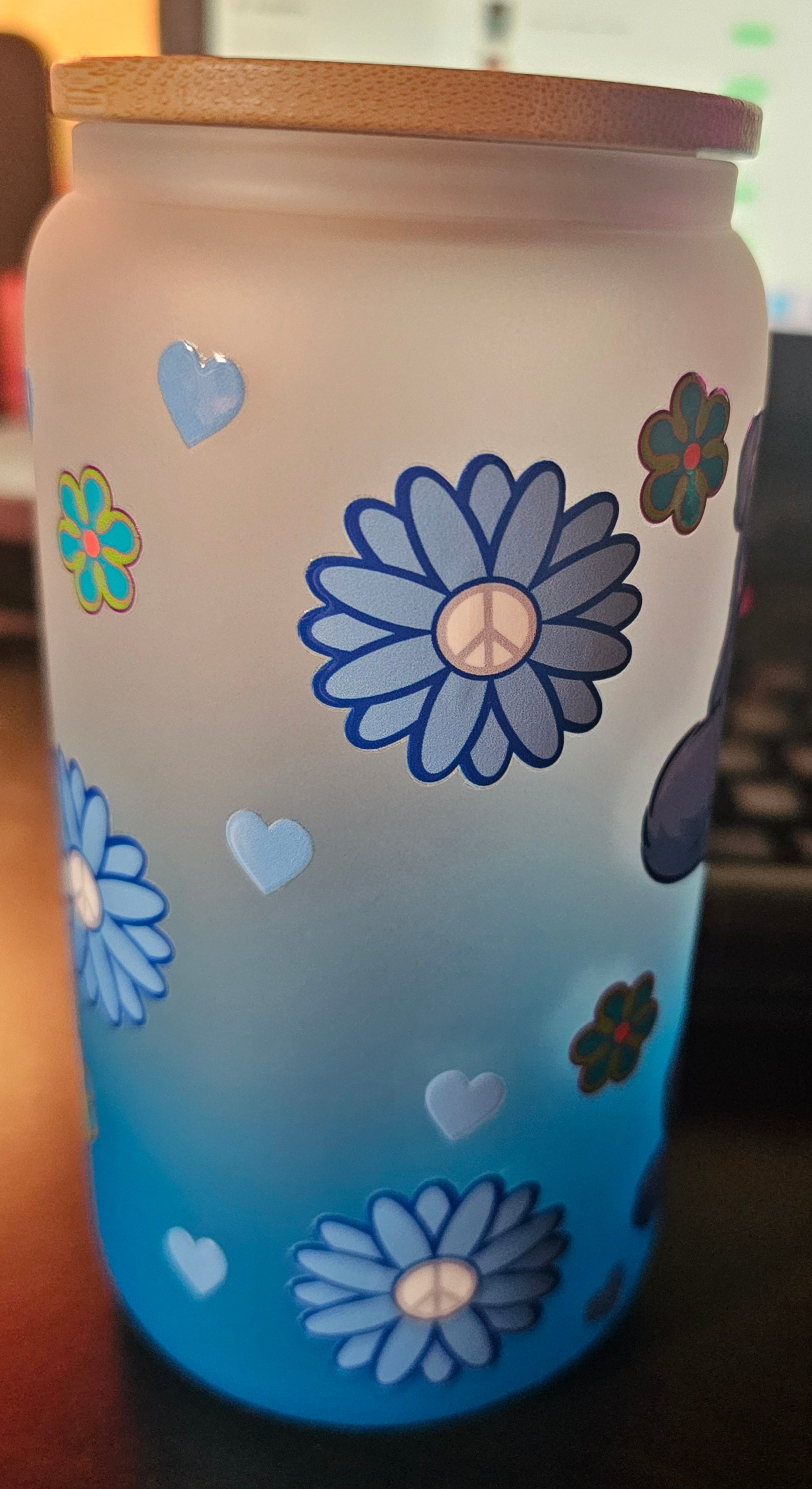 This is a 16oz glass hombre cup with a bamboo lid. This bear is awesome and available for purchase.